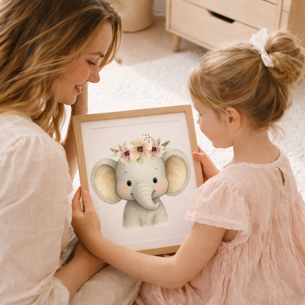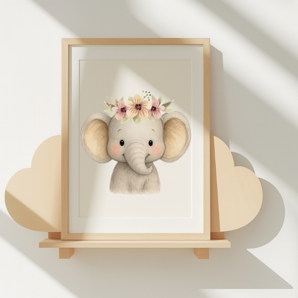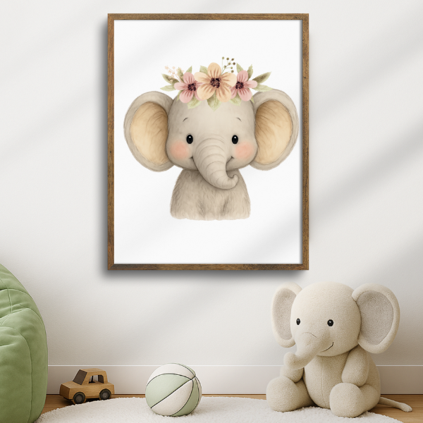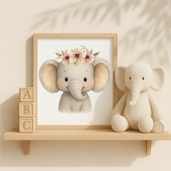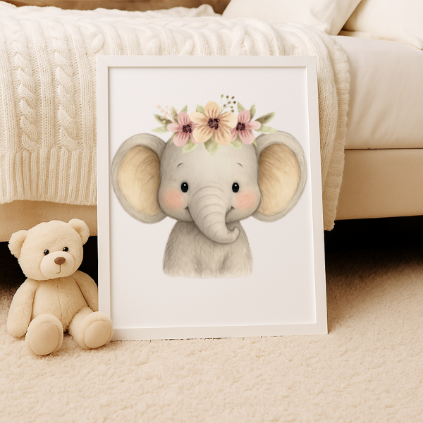 Bring the charm of the wild into your little one’s room with this **Baby Elephant Digital Wall Art**. This beautifully illustrated design features a cute elephant with a delicate floral crown, making it an ideal addition to a **safari, jungle, or woodland-themed nursery**.