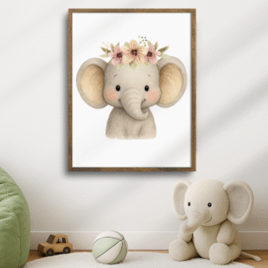 Bring the charm of the wild into your little one’s room with this **Baby Elephant Digital Wall Art**. This beautifully illustrated design features a cute elephant with a delicate floral crown, making it an ideal addition to a **safari, jungle, or woodland-themed nursery**.