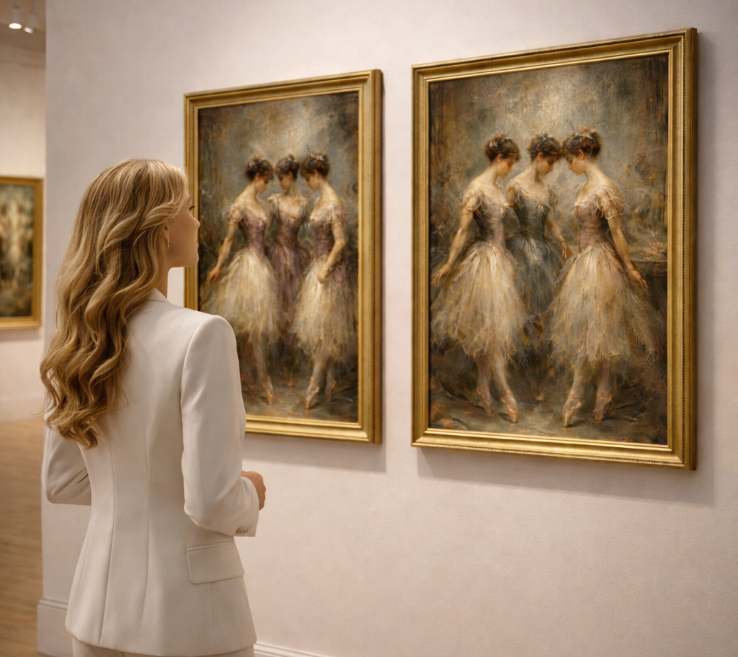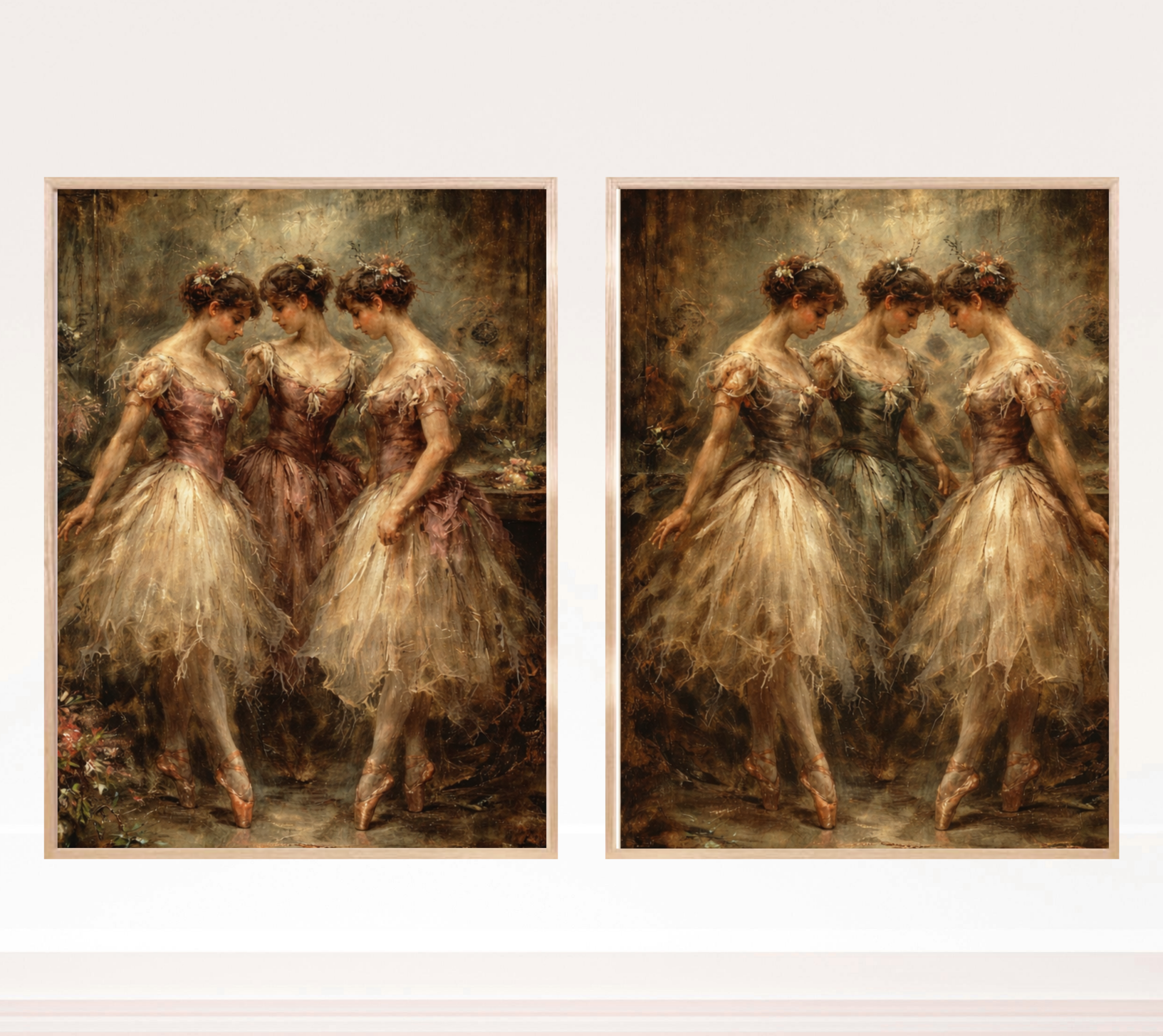 Inspired by classical ballet and traditional oil painting aesthetics, this diptych features graceful ballerinas captured in soft, neutral tones with visible brushstroke textures. The composition evokes movement, harmony, and refined femininity, making it ideal for sophisticated interiors.