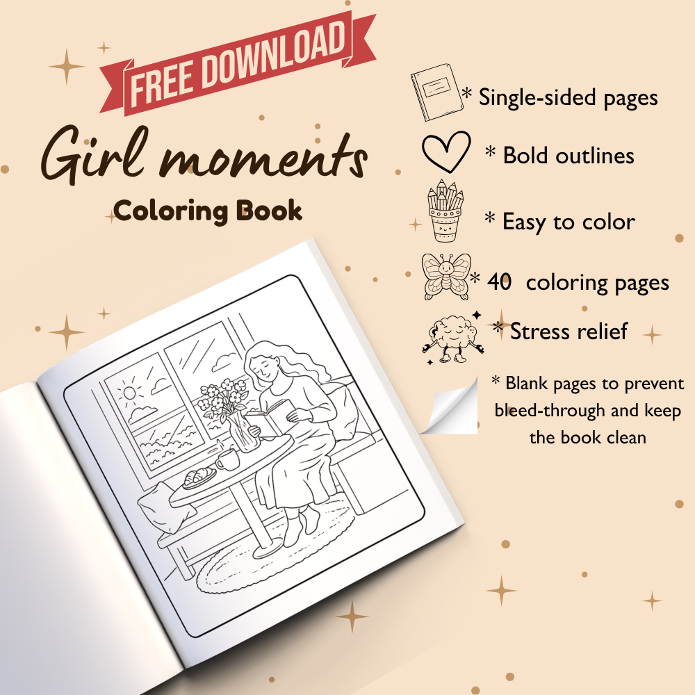 Escape into a world of comfort, calm, and creativity with the Girl Moments Coloring Book for Teens & Adults — a beautifully designed collection of 40 cozy coloring pages made to inspire relaxation and mindfulness.