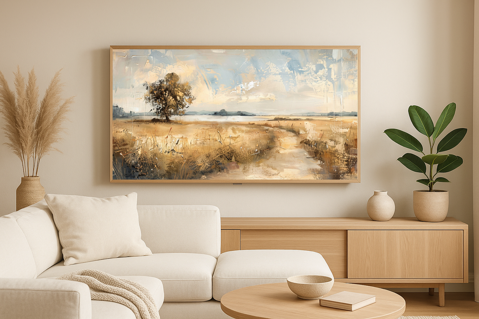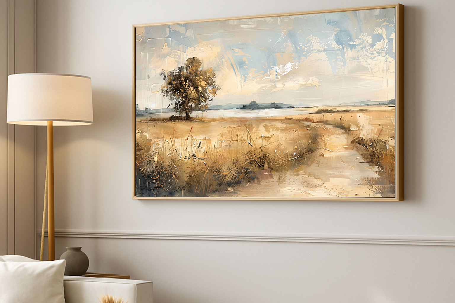 Transform your blank TV screen into a serene piece of art with our **Spring Fields TV Frame**. This digital download captures a peaceful countryside scene painted in soft beige, earthy browns, and sky blues. Inspired by classic oil techniques, it blends traditional texture with a modern aesthetic, ideal for spring and year-round decor.